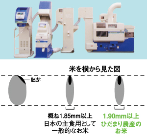 ひだまり農産では、お米のひと粒ひと粒をていねいに「良品・良質米選別」しています。籾摺機(もみすりき)で玄米にしたあと、一般出荷基準である1.85mmの網目の米選別機で一次選別を。それから光選別機で被害米や不良品を除き、さらに1.90mmのL網目の選別計量機で選別するという、通常よりも手間をかけて、粒揃いのお米をお届けしています。